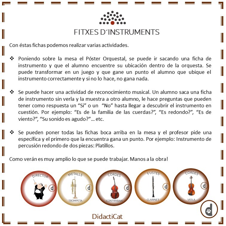 Orquestando - Kit y Poster Orquestal. Kit con actividades y juegos para trabajar la clasificación de los instrumentos y su ubicación en la Orquestra Sinfónica.